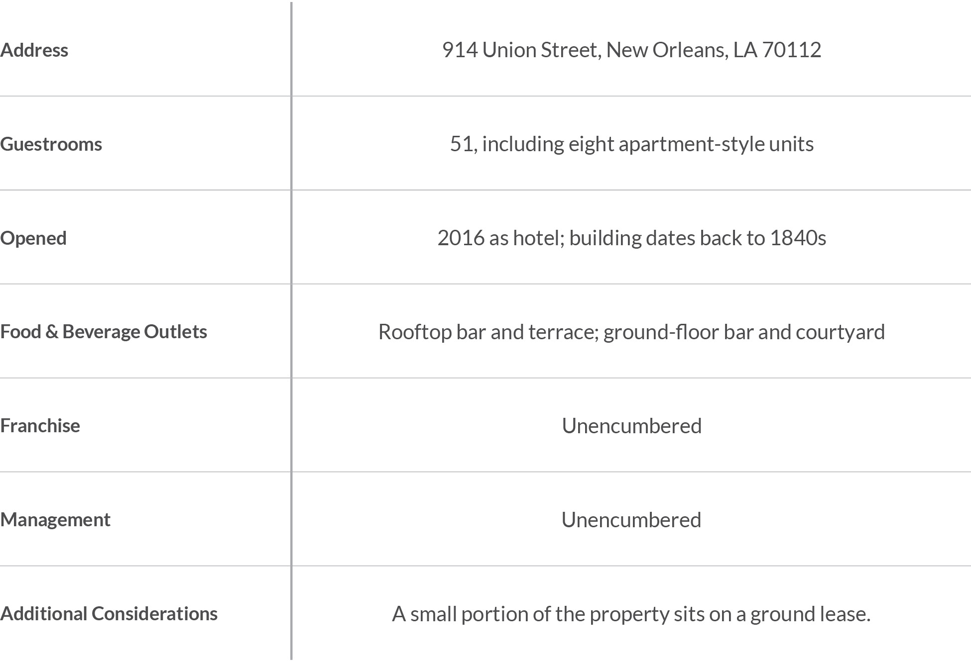 The Catahoula represents the opportunity to acquire a distinctive, perfectly scaled boutique hotel that is primed for immediate growth in the heart of one of the most iconic hospitality destinations in the United States.